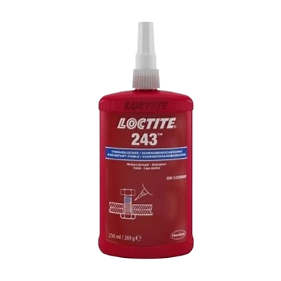 Loctite 243 is a medium strength blue threadlocking adhesive that seals and secures metal nuts and bolts to prevent loosening due to shock and vibration.