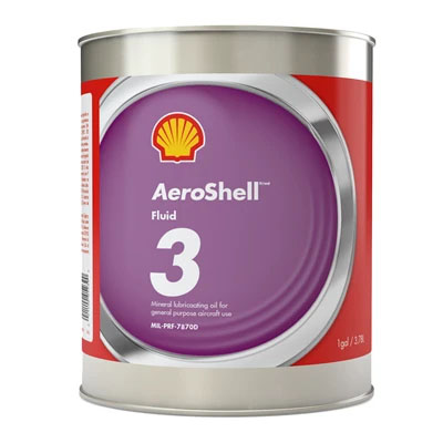 AeroShell Fluid 3 is a general purpose mineral lubricating oil for general lubrication of aircraft parts that require a light oil with good temperature characteristics and a low freezing point. It is inhibited against oxidation and corrosion.