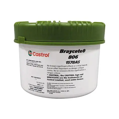 Castrol Braycote 806 is an NLGI #2 grease with a smooth, buttery texture, made from a perfluoroether base oil. It offers thermal stability, nonflammability, and chemical inertness to common fuels, solvents, and oxidizers.